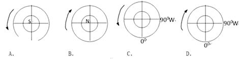 地球自转方向是自西向东转,在北极上空看,是逆时针方向。在南极上空看,是顺时针方向。读图判断,A、B错。图C中顺自转方向0度经线以东是东经,不应是西经度,C错,D对。