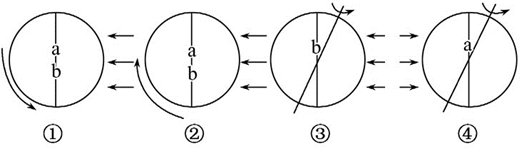 【小题1】①图为以北极点为中心的俯视图,图中右侧是昼半球、左侧是夜半球,因此a为昏线、b为晨线;②图为以南极点为中心的俯视图,图中右侧是昼半球、左侧是夜半球,因此a为晨线、b为昏线;③、④均为侧视图,图③中b为晨线,图④中a为昏线。
