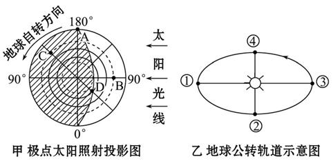 2、单选题 (2012·佛山模拟)读极点太阳照射投影图和地球公转轨道示意图,完成下列问题。