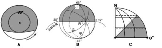 (3)C图所示日期,正午太阳高度达一年中最大值和最小值的纬度分布范围分别是 、
