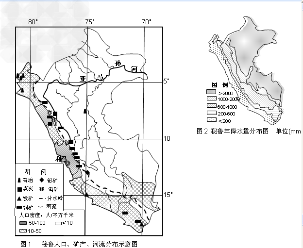 (1)读图2,秘鲁年降水量分布特点是____________________。秘鲁沿海年降水量200mm以下地区降水较少的原因是受_______________________影响。