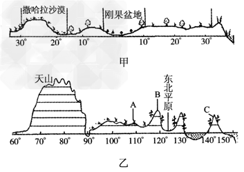 3、综合题 下面甲、乙两图分别为沿经线、纬线的地形剖面和自然带分布图,读图,完成下列问题。