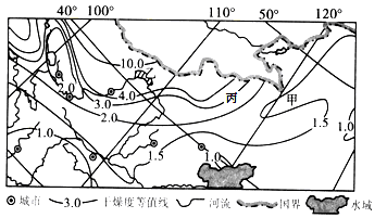 小题2:读图,根据数值变化规律,甲处干燥度较低,说明是蒸发少或降水较多,背风坡降水少,数值应较大,A错。图中乙处与丙处等值线差值不同,如果等差都是1.0,乙处等值线更密集,乙处比丙处干燥度变化快,B错。本区域干燥度自东向西递增,C错。影响该区域干燥度分布最主要因素是海陆位置,D对。