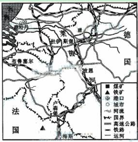 本题解析:本题主要考查了工业区位条件、各种交通运输的特点。由图中城市位置德国杜伊斯堡离煤矿近,法国梅斯离铁矿区位尽,有利于就近获得燃料和原料。煤、铁矿石运量大,需要选择运量大、价格低的运输方式。
