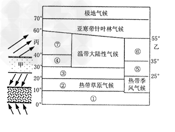 4、单选题 下图为气候类型分布模式图,图左侧是某季节气压带风带位置示意图,据此完成1 一2 题。