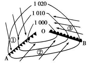 点评:本题难度一般,学生只要能结合根据等值线“凸高为低,凸低为高”原理,画出风向,进而画出北半球的锋面气旋图示,结合影响我国的常见的天气系统形成的典型天气判断。画图是解题的关键。