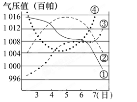 5、单选题 该图为“某月3日~7日四种天气系统经过不同地区时气压变化过程曲线图”,读后回答7~9题。