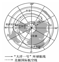 2、单选题 2001年中国东方航空公司穿越北极的国际航线试飞成功,从上海(30°N,121°E)至芝加哥(42°N,88°W)仅用15小时35分钟。读图及相关材料,回答下列各题。