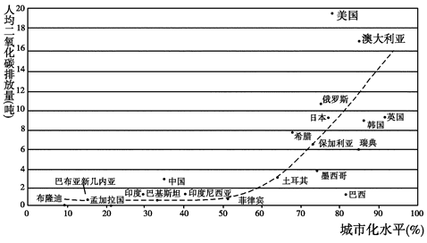 材料二 人均二氧化碳排放量与城市化水平关系图