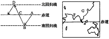 (2)当太阳直射点位于B时,图中G地的盛行风向是_________,成因是____________________________