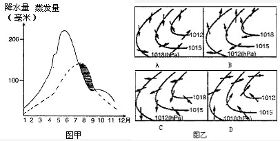 小题2:当该地正值图甲中阴影部分对应的月份时,图乙中的天气系统持续稳定在该地区较长时间时,我国将出现