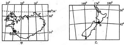 本题解析:向北增大为北纬,向南增大为南纬,向东增大为东经,向西增大为西经,所以冰岛位于北半球,乙图新西兰位于南半球,冰岛为西经,新西兰为东经,两者经度跨度大于180°,所以甲位于乙的东北方向。所以本题选择B选项。