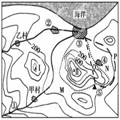 1.图示区域最高处与乙村的高差可能为2.下列地点位于①处视野范围的是3.为了将⑤地的铁矿运到③镇附近加工出口,图中M、N、P、Q四条公路线设计合理的是
