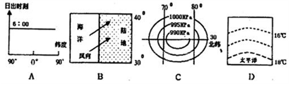 小题3:根据C点的地方时为0:00,则为北半球的夏半年,则北半球昼长于夜,北半球日出早于6:00;北半球地中海气候区受副热带高压控制,亚欧大陆形成低压,低压中心位于印度;太平洋等温线向南凸出。所以本题选择C选项。