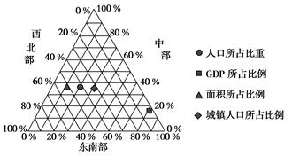 (2)东南部GDP所占比重大,说明东南部经济发达,城镇人口所占比重高,人口密度大,说明东南部城市化水平高;西北部相反。(4分)