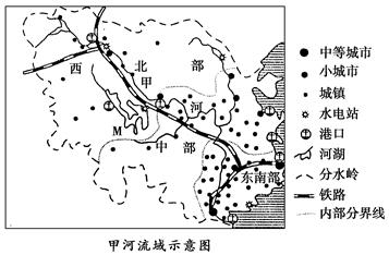 (1)甲河流域城市分布的特点是__________________________________该流域城市体系较为合理,主要表现在_____________________________________。(4分)