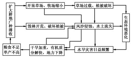 参考答案:(1)过度开垦草场;过度放牧;毁林开荒、破坏植被(每点2分,共6分,其它答案只要言之有理可酌情给分)?