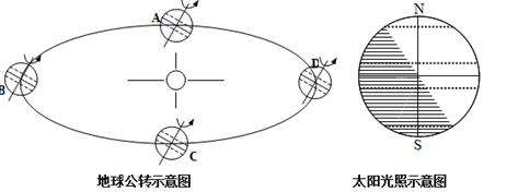 (3)根据左图可以判断,A点为春分日,B点为夏至日,C点为秋分日,D点为冬至日。右图太阳光照图显示北极圈及其以北地区为极昼现象,为夏至日。此时北回归线及其以北地区正午太阳高度达一年中的最大值,北半球昼长达一年中最大值,此日之后,太阳直射点向南移动。