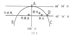 1、单选题 ?由于大气的散射作用,人们把黄昏的余晖与黎明的曙光相接的现象叫“白夜”,白夜线是指白夜现象发生的最低纬度。图5中弧线BAC为晨昏线。当北半球发生白夜现象范围最大时,读图回答下题。