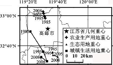 4、单选题 在地理研究中,可用重心移动反映地理事物和现象空间分布的变化,下图中表示江苏省1985~2008年几种用地重心变化的轨迹。读图分析可知