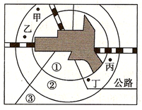 1.如果该城市甲乙丙丁四处均是有空气污染的工厂,这种工业布局最合适的地区是2.如果图中①②③代表城市近郊到远郊的农业用地,合理的农业布局是