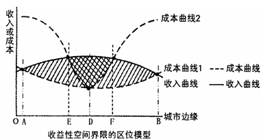 5、单选题 企业总是布局在有利润空间的地方,这一原理通过空间成本曲线或空间收入曲线来反映。图是某类企业收益性空间界限的区位模型(O代表市中心),当图中成本曲线由1变为2后,完成下列各题。