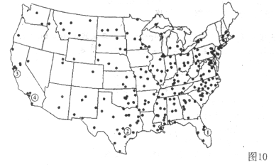 4、单选题 图10是美国本土某种工业生产的分布图,读图并结合所学地理原理回答问题。