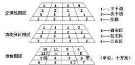2、单选题 读某城市部分地区经过数字化处理的“交通线、功能分区、地价”图,回答问题。