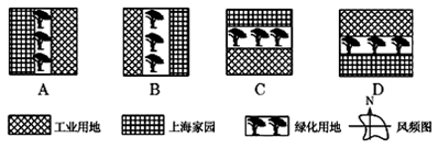 小题2:宝山区是工业区,在宝山区建商品房应位于工业区的上风向,工业区位于最小风频上风向。看上图中的风频图,最小风频为西风,所以工业区应位于西边,商品房则位于东边,之间建绿化带。与之符合的是B。