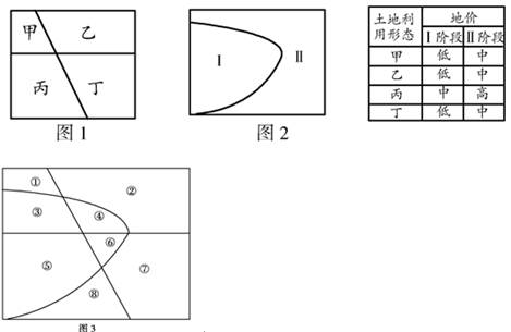 3、单选题 某城市的土地利用形态分为甲、乙、丙、丁4种(图1),城市的发展先后经历了Ⅰ、Ⅱ两个阶段(图2)。目前该城市的地价与土地利用形态和开发阶段有关,其关系如下表。读图表完成问题。