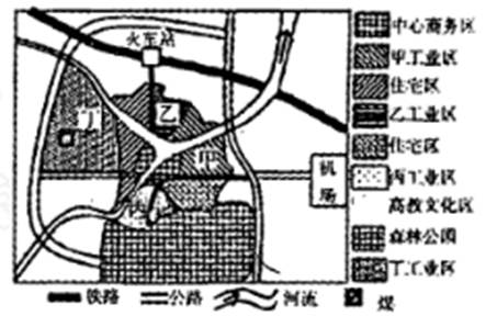 4、单选题 某家电厂生产规模不断扩大,吸引了若干零部件商来图中城市落户,形成了一个家电工业区。下图为此城市功能分区现状图,读图完成下列各题。