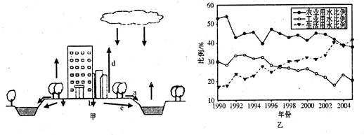(5)读“1990~2005年北京市用水量(比例)变化情况图”(图乙),指出北京市1990年以来用水量比例变化的趋势,并简析用水量比例变化的主要原因。(10分)