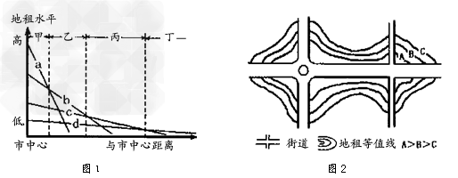 4、单选题 下图1表示各类用地付租水平与市中心距离的关系,图2表示城市地租分布等值线分布,读图回答1~2题。