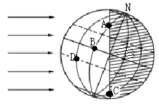 4、单选题 下图中弧N为某局部经线圈,A、B两地纬度相同,O为该经线圈圆心,图中太阳光(→)与N位于同一平面,且与A相切。读图完成下题。