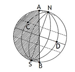 4、单选题 (10分)下图中阴影部分表示夜半球,读图后完成下列问题: