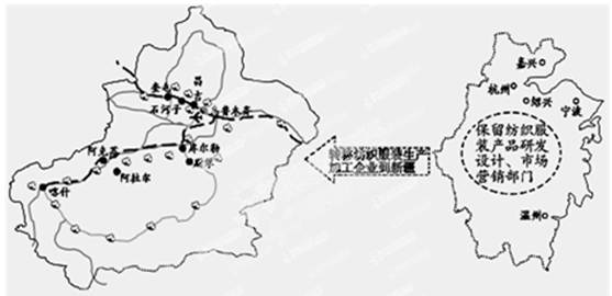 资料三:下图为“浙江纺织服装业向新疆转移示意图”。