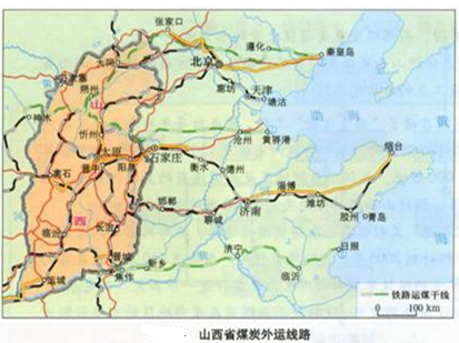 (2)根据图示:从路网体系上看,晋煤外运的主要运输方式是铁路,铁路的运量较大,运速较快,运费较低,受自然因素影响小,连续性好。