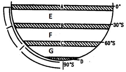 (2)C处位于60°S附近,其南北分别是性质相反的极地东风带和盛行西风带,二者在此交汇后,暖空气上升,从而形成低气压带,称为副极地低气压带。