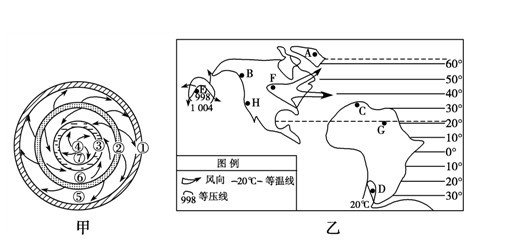 (1)图甲表示 (南、北)半球的气压带、风带分布状况。
