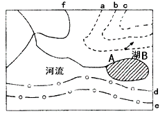 2、单选题 下图中a、b、c线为等压线,箭头表示A地风向,d、e线为等温线,f线为等高线。回答下列各题。