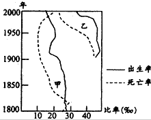 1、单选题 读下面“甲、乙两国人口出生率与死亡率变化曲线图”,完成1—2题。