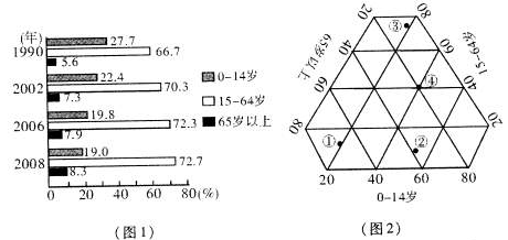 小题2:图1中的2008年年龄构成与图2中的①②③④四点一致的是(?)