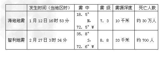 4.海地地震的震级比智利小,但死亡人数远高于智利,试根据材料及相关知识分析其中的原因(至少3个方面)________________________________________________________________________________________________________________________________________________________。