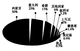 2、单选题 橄榄油被称为“液体黄金”。读2002年世界橄榄油主产国产量比例示意图,完成1—2题。