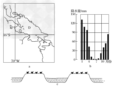 D湖泊(图a)的湖面海拔约3800米,降水资料如图b所示。D湖沿岸地区地形平坦,发现有大量古代农耕遗迹,包括相互交织的人工堆土高台、人工水渠(图c),以及人工运河和水塘。