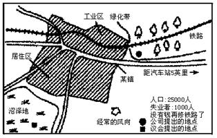 有一家食盐化工公司准备在该镇附近(图中●处)建一新的分厂,但是当地议会反对这一地点,因为它位于绿化带内,他们建议在图中■处填平一块沼泽地建工厂。