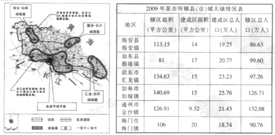 (2)南通所辖县(市)建成区人口密度最大的是___。该地区城镇以组团式发展的好处是:___。(3分)