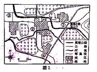 2、单选题 图2为某个组团式城市布局图,各城区分散布局。完成下题。