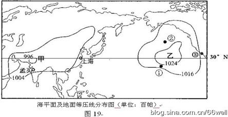 本题解析:本题考查等压线天气图。(1)图示甲中心气压较四周低,判断为亚洲低压;乙中心气压较四周高,判断为夏威夷高压。导致甲乙两地气压差异的直接原因是海陆热力性质的差异。(2)图示①处等压线较②处密,判断风力较大。③位于30°--40°的大陆西岸,为地中海气候,此时亚欧大陆上为低压,判断为北半球夏季,则地中海气候高温少雨。(3)图示亚欧大陆上为亚洲低压,判断为北半球夏季,故上海盛行东南季风。孟买为南亚,夏季盛行西南季风,其成因主要从气压带风带的移动角度分析。