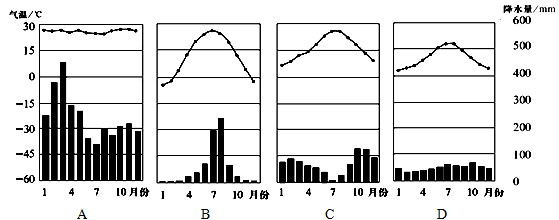 【小题2】结合前面分析,该地位于季风气候区,河流流量季节变化大,D对,B错。冬季没有断流现象,A错。位于热带,没有凌汛现象,C错。